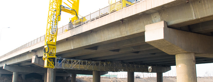 橋梁檢測車廣泛適用於大中型橋梁的病害維修和預防性檢查作業,如對大橋下麵各結構進行全麵的檢查、維修與維護(油漆、噴砂、安裝、拆卸),包括對大橋主梁梁底裂紋檢測和全橋支座檢查養護,也可以安裝和維護橋下管道和電纜。